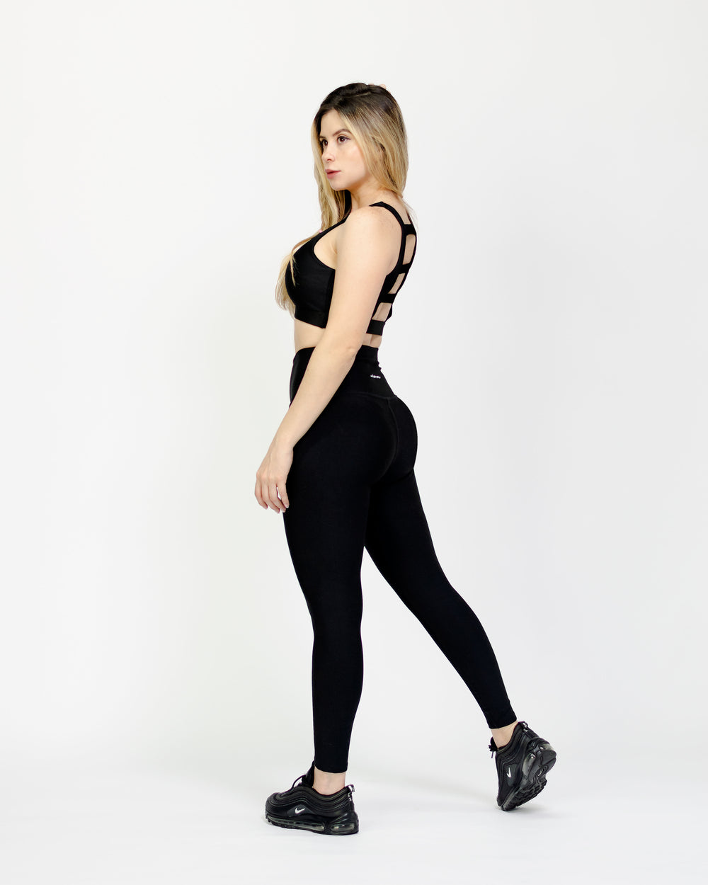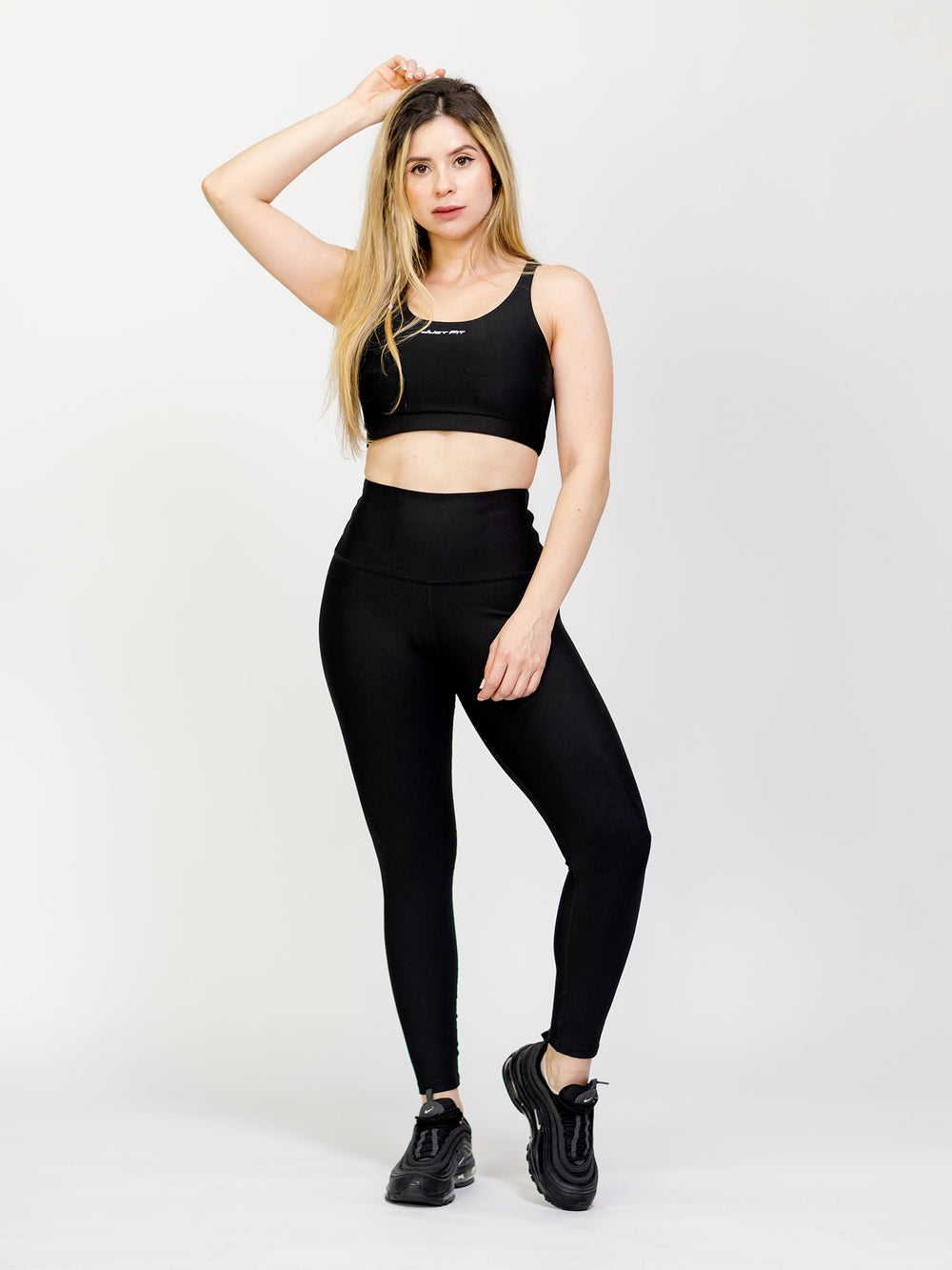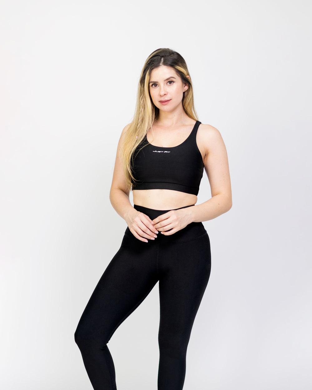 Set deportivo Julia color negro, con top sin mangas y escote en la espalda, y legging mate color negro, fajón alto.